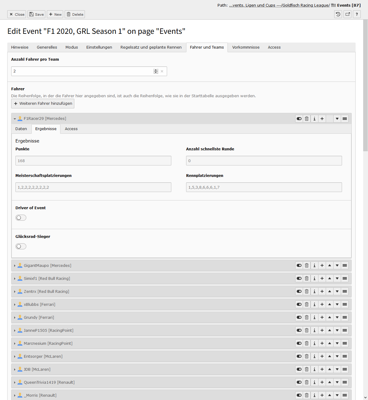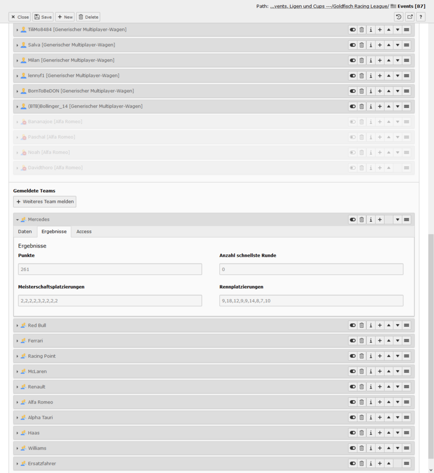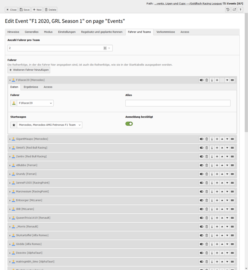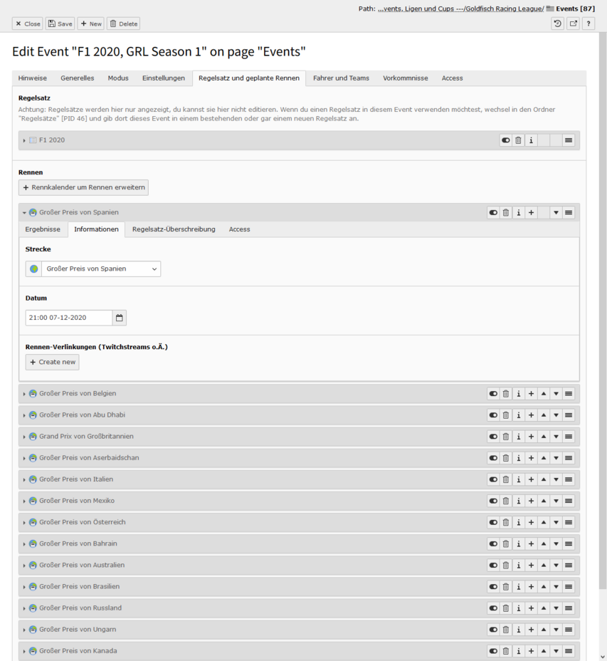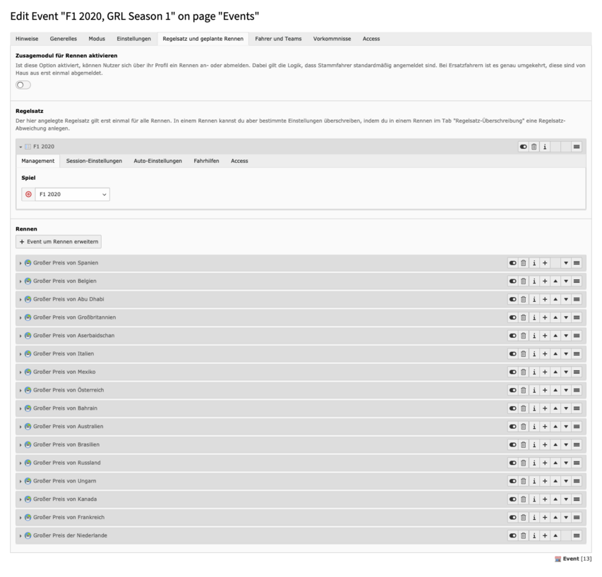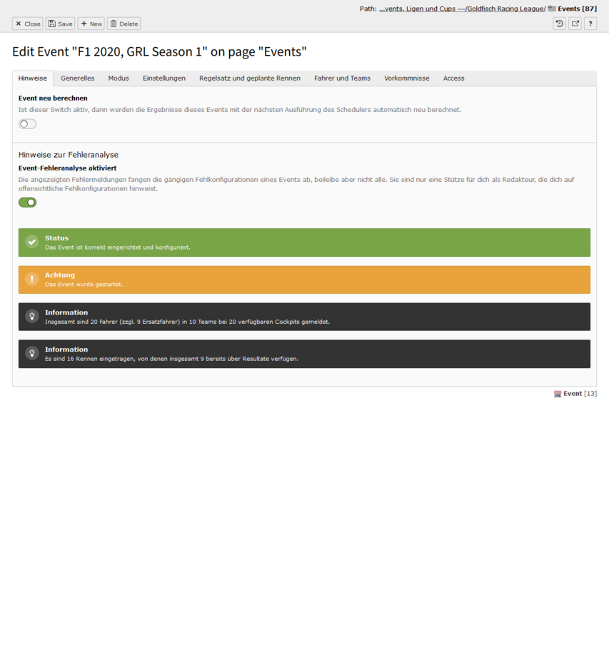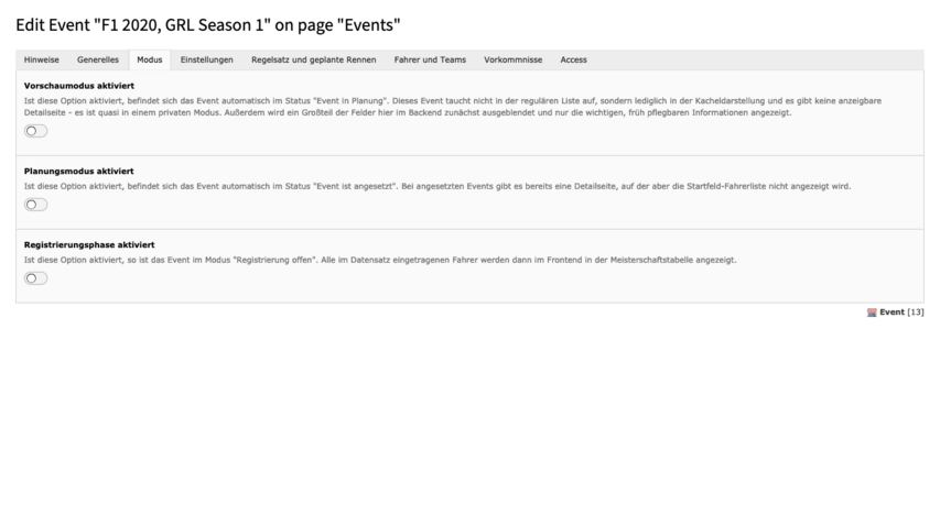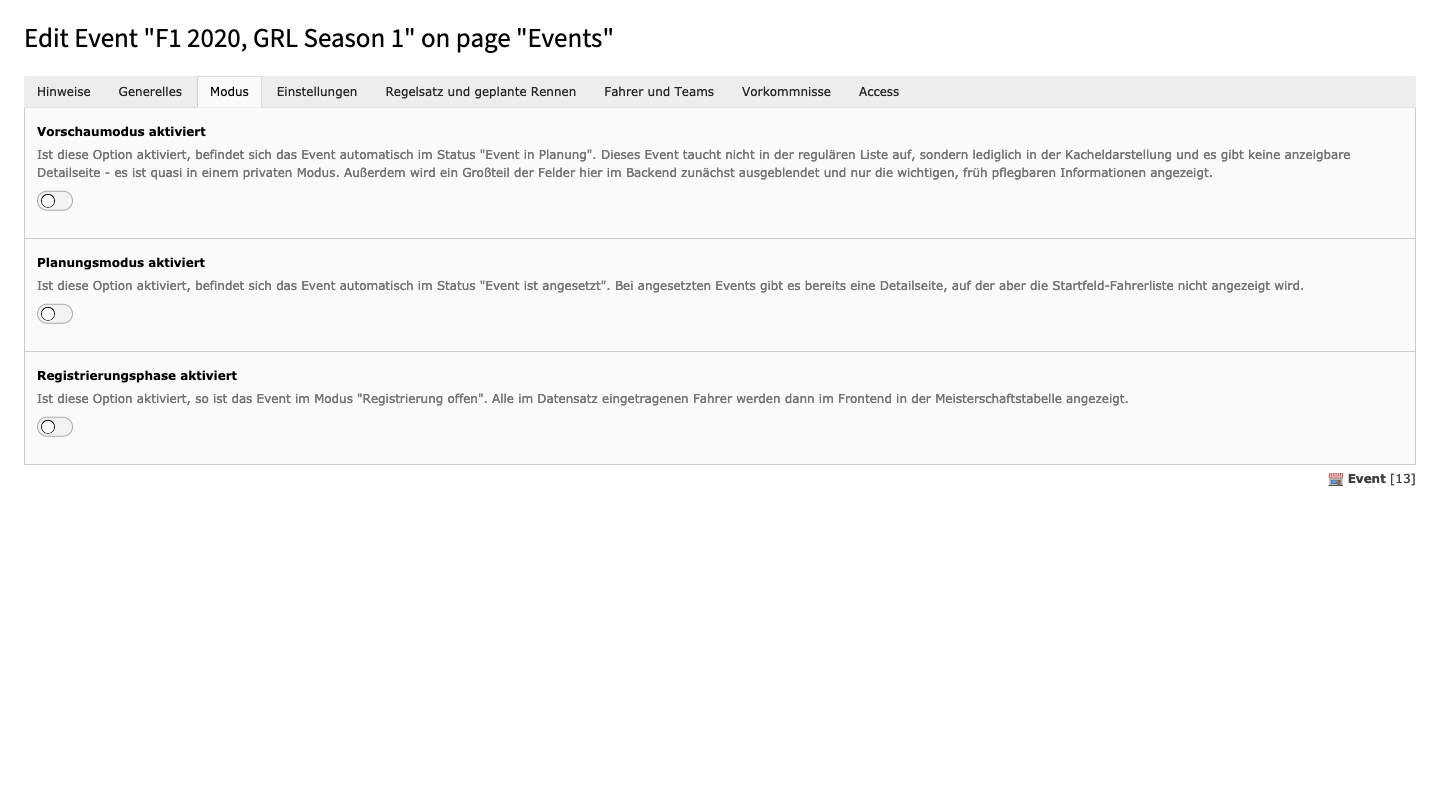 Sind alle Switches aktiviert, dann ist das Event im Status Ansetzung bestätigt. In diesem Modus kann man keine Detailseite sehen, es wird nur in Teasern dargestellt. Deaktiviert man den ersten Switch, dann tauchen im Event-Datensatz viele neue Felder auf und es wechselt in den Status In Planung. In diesem Modus ist die Detailseite aufrufbar, es tauchen aber keine Informationen zum Fahrerfeld auf. Das ändert sich auch nicht, wenn man den zweiten Switch deaktviert, auch dort bleibt das Fahrerfeld verborgen - das Event ist nun aber im Status Registrierung geöffnet. Derzeit ist diese Phase noch ohne Funktion, zu einem späteren Zeitpunkt kann man hier aber eine Selbstregistrierung über die Website sich gut vorstellen. Deaktiviert man den letzten Switch und schließt damit die Registrierung, passiert genau das - das Event ist im Status Registrierung geschlossen.