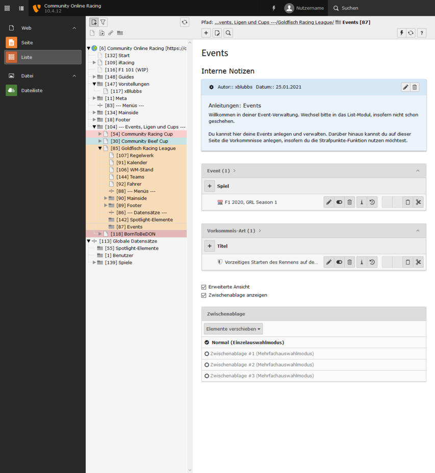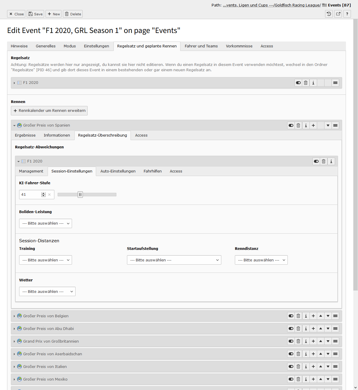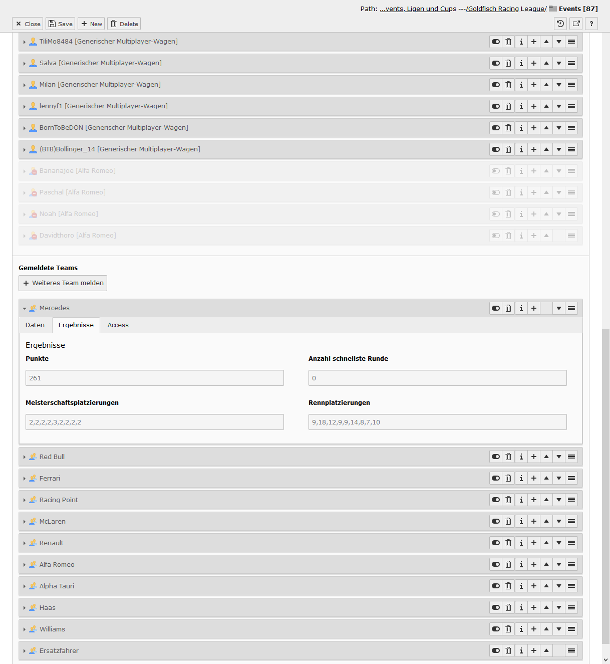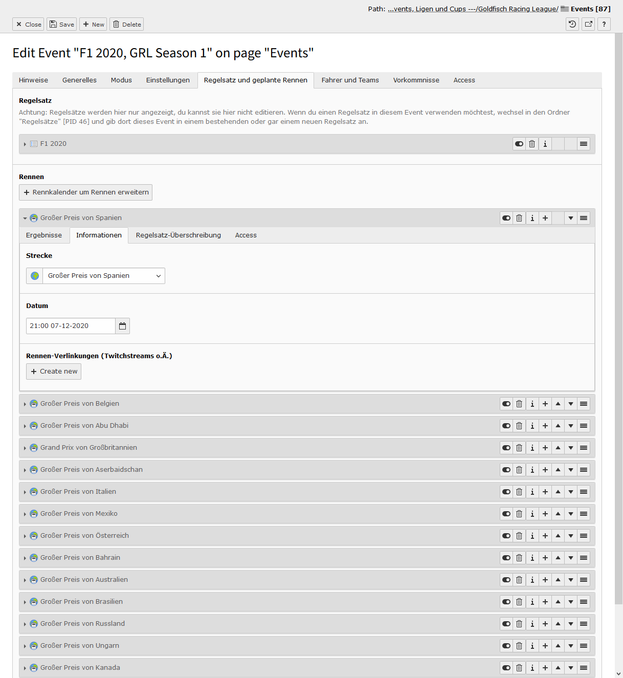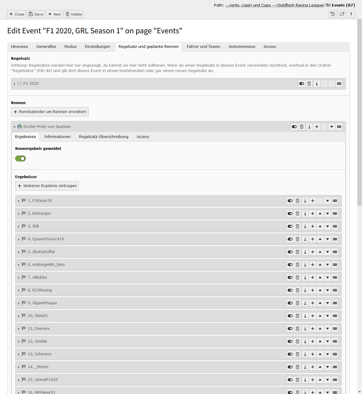 Sind alle Switches aktiviert, dann ist das Event im Status Ansetzung bestätigt. In diesem Modus kann man keine Detailseite sehen, es wird nur in Teasern dargestellt. Deaktiviert man den ersten Switch, dann tauchen im Event-Datensatz viele neue Felder auf und es wechselt in den Status In Planung. In diesem Modus ist die Detailseite aufrufbar, es tauchen aber keine Informationen zum Fahrerfeld auf. Das ändert sich auch nicht, wenn man den zweiten Switch deaktviert, auch dort bleibt das Fahrerfeld verborgen - das Event ist nun aber im Status Registrierung geöffnet. Derzeit ist diese Phase noch ohne Funktion, zu einem späteren Zeitpunkt kann man hier aber eine Selbstregistrierung über die Website sich gut vorstellen. Deaktiviert man den letzten Switch und schließt damit die Registrierung, passiert genau das - das Event ist im Status Registrierung geschlossen.