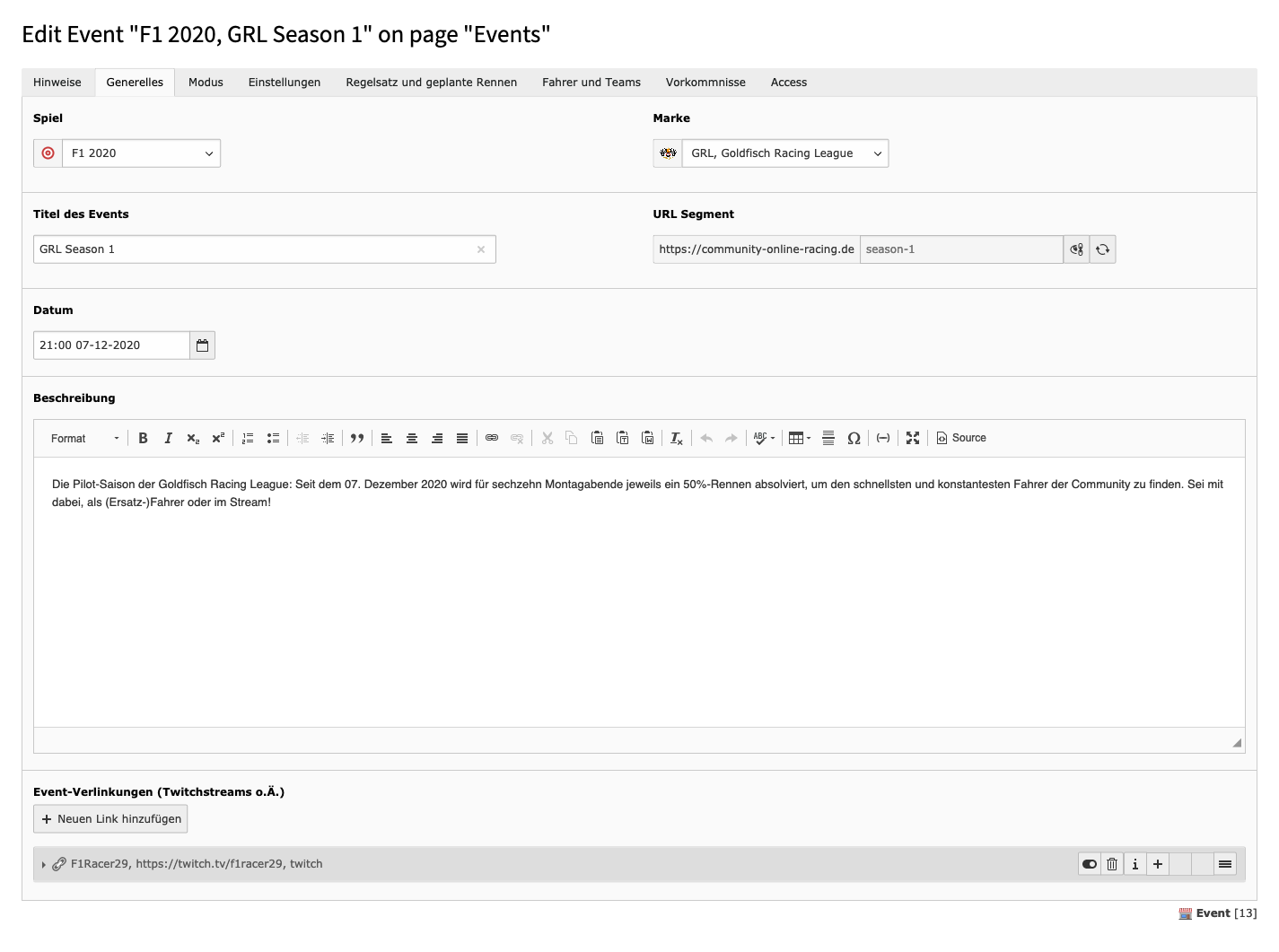URL Segment: Technisch notwendiges Feld: Das, was hier eingetragen wird, ist später verantwortlich für den Teil in der URL (https://community-online-racing.de/deine-seite/event-seite/detail/das-was-hier-steht). Der Wert kann zu jedem Zeitpunkt angepasst werden, empfiehlt sich aber nicht - deswegen überleg vorher gut, wie die URL zu deinem Event lauten soll.
