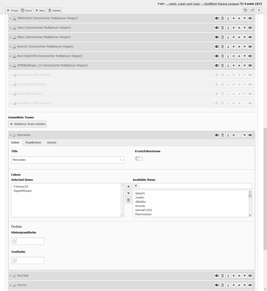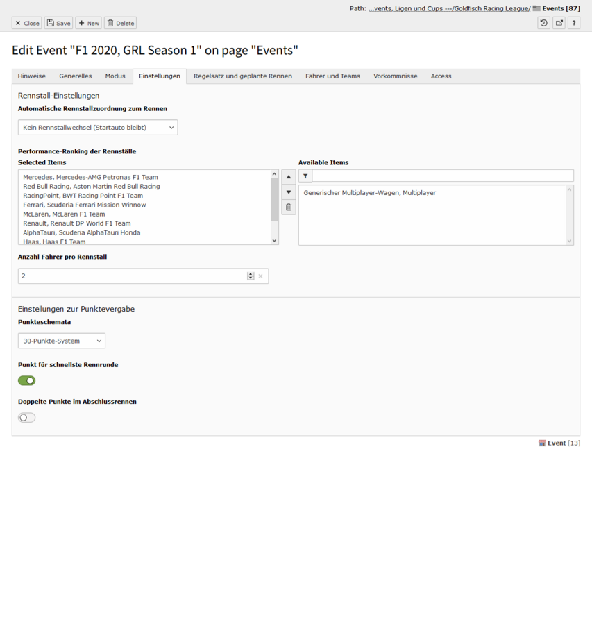 Im ersten Abschnitt dieses Tabs geht es um die Rennstallzuordnung. In einem Event gibt es eine Trennung zwischen Team und Rennstall, weil man dadurch in der Eventplanung es erreichen kann, die Rennställe dynamisch vom System zuordnen zu lassen. Der zweite Abschnitt dreht sich dann um die Punktevergabe.
