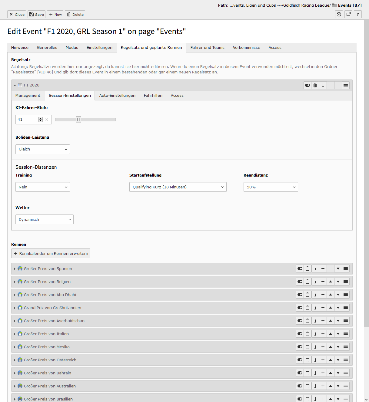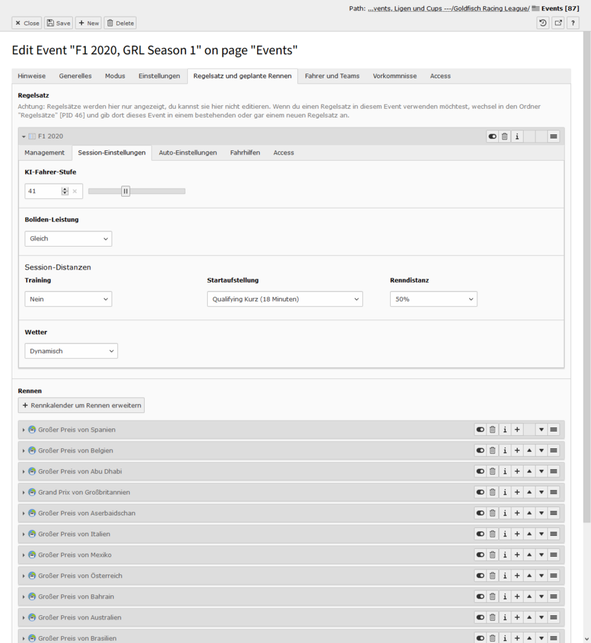 Tab "Regelsatz und geplante Rennen"