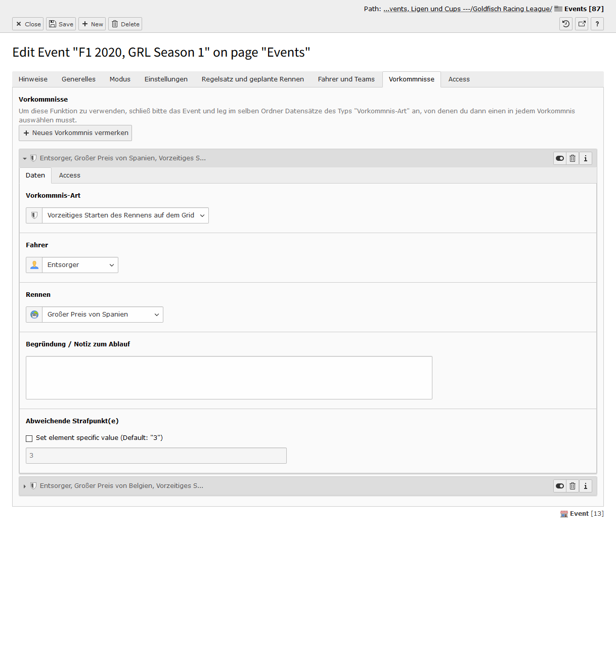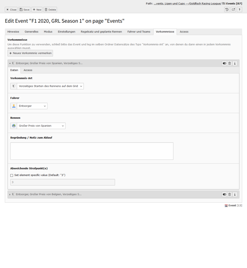 Ein Vorkommnis muss zwingend einer Strecke sowie einem Fahrer zugewiesen sein. Du kannst optional eine kurze oder auch längere Begründung bzw. Notiz zum Vorfall hinterlegen sowie die für den Vorfall eigentlich festgesetzten Strafpunkte überschreiben. Außerdem musst du eine Vorkommnis-Art auswählen, von denen du beliebig viele redaktionell anlegen kannst (vgl. Abschnitt Wie du zu deinen Events kommst). Ein solcher Datensatz hat einen Titel, eine Erklärung zu der Strafe sowie optional festgesetzt Strafpunkt-Anzahl.