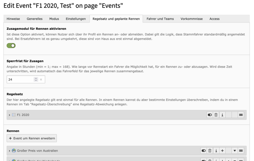 Schritt 1: In deinem Eventdatensatz aktivierst du im Tab Regelsatz und geplante Rennen die Option Zusagemodul für Rennen aktivieren und lässt die Seite einmal sich aktualisieren (siehe Screenshot 1).