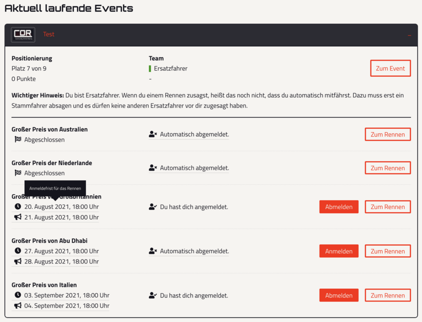 Bist du ein Stammfahrer für das jeweilige Event, dann bist du automatisch für die Rennen angemeldet. Du musst also nur etwas tun, wenn du deine Teilnahme bei einem Rennen absagen musst.