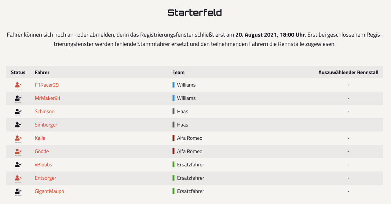 Den aktuellen Zustand über die Zu- oder Absagen findet man auf der Rennseite. In der Tabelle sieht man zum einen den Status der Fahrer, zum anderen sieht man auch die Reihenfolge, in der die Ersatzfahrer in die freien Cockpits nachrücken, wenn welche frei werden (von oben nach unten, nur die Zugesagten). Sagen mehr Stammfahrer ab als mit Ersatzfahrern aufgefüllt werden können, schauen die letzten Stammfahrer in die Röhre und werden als DNA markiert (siehe Screenshot 3 bis 5).